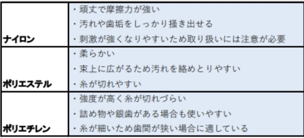 デンタルフロスの素材には、「ナイロン」「ポリエステル」「ポリエチレン」の3種類があります。
